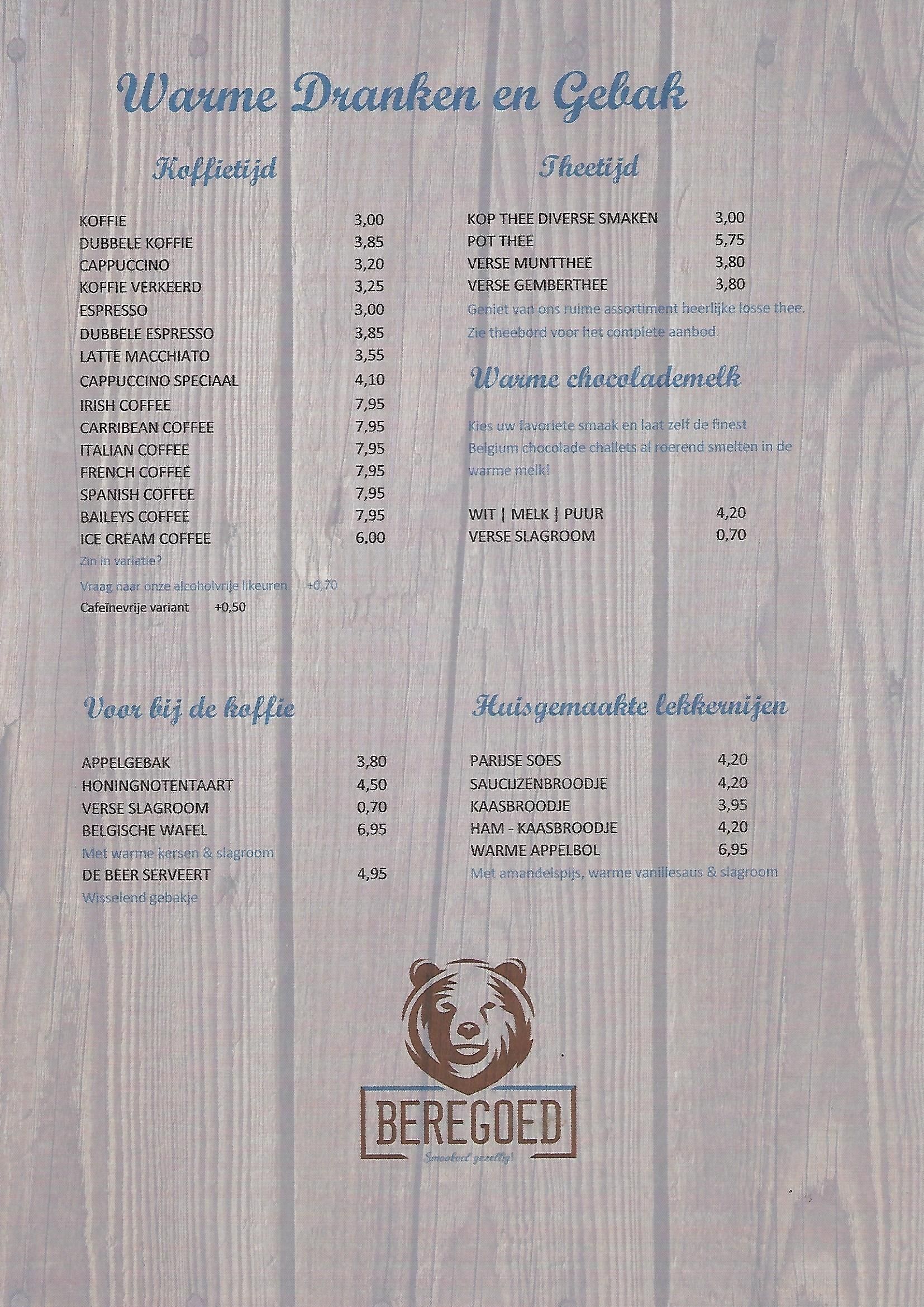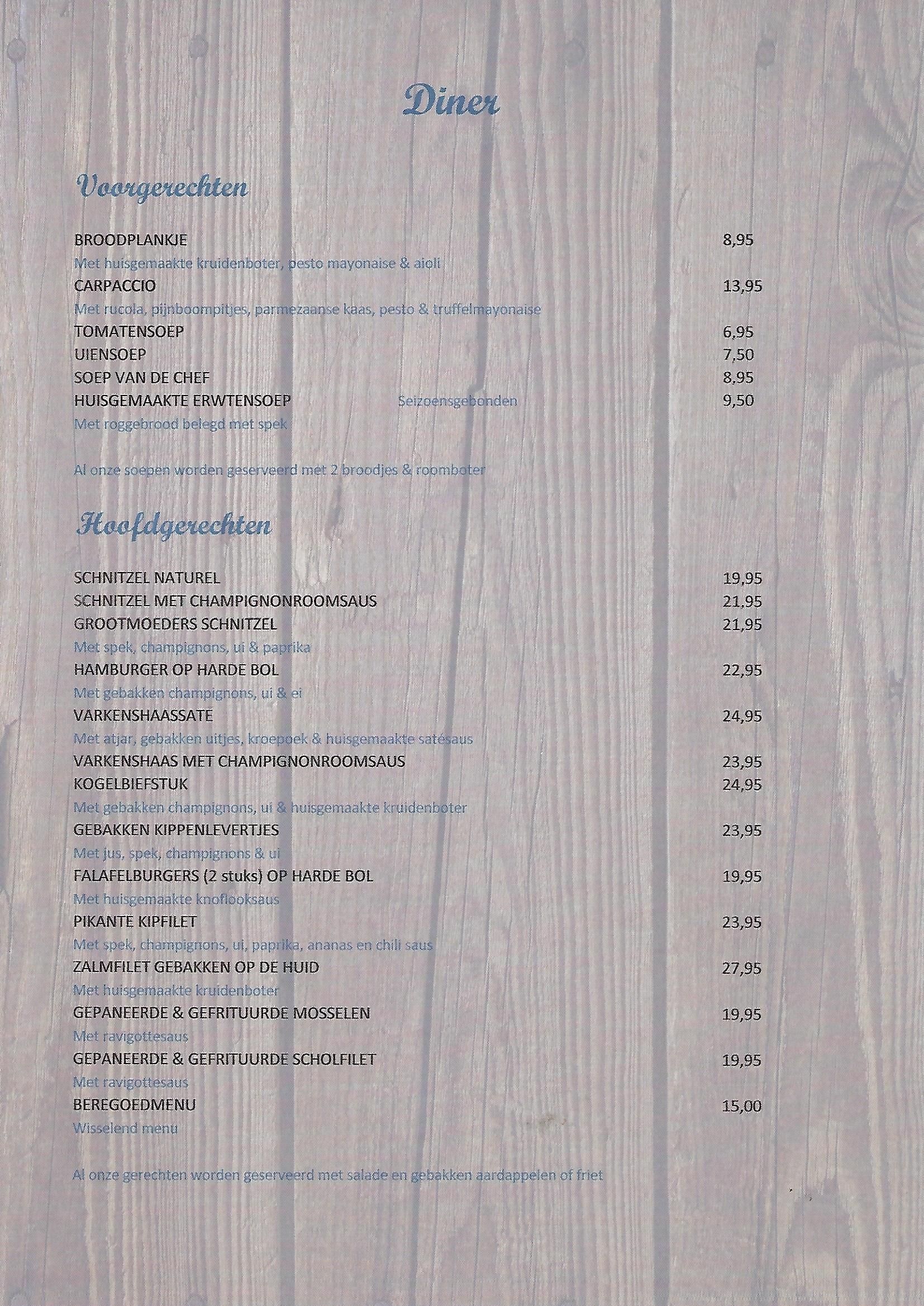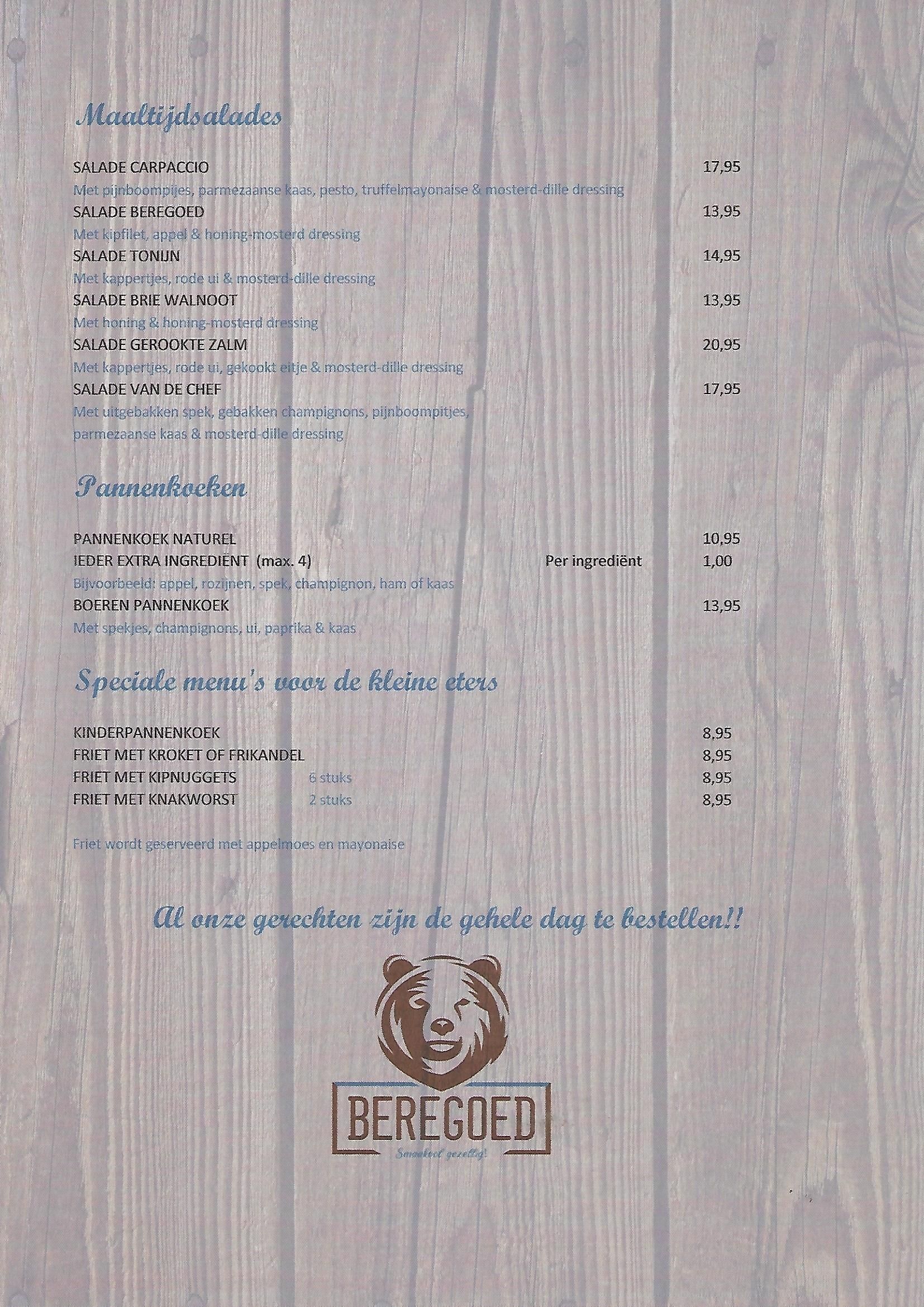 Naast de items hieronder bieden we tevens dagelijks voor slechts €15,00 een speciaal Beregoedmenu aan bereid met verse ingrediënten.
