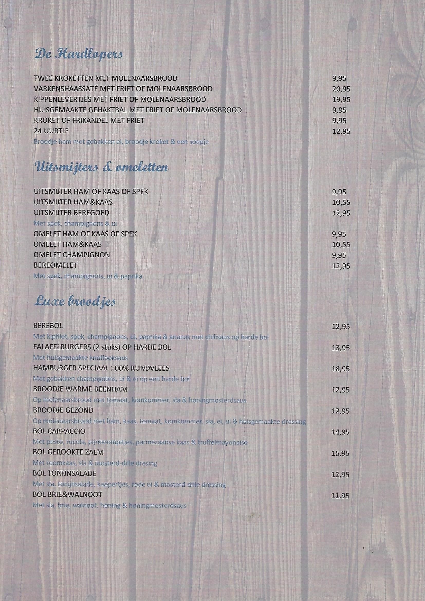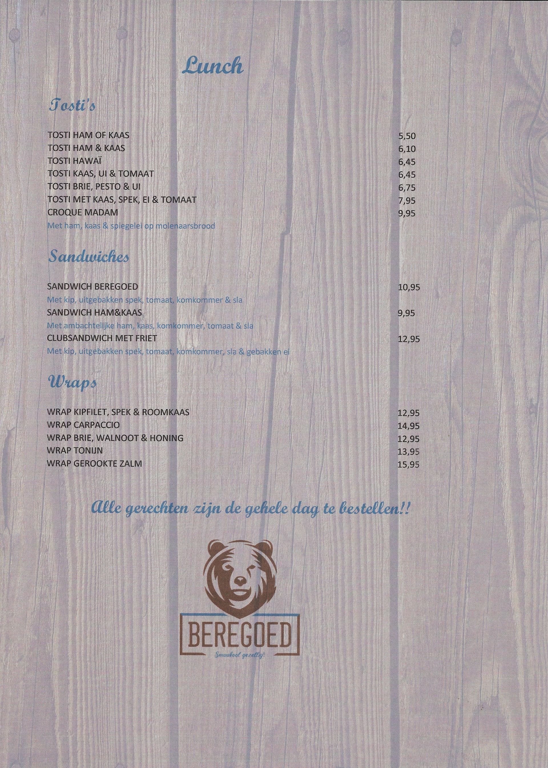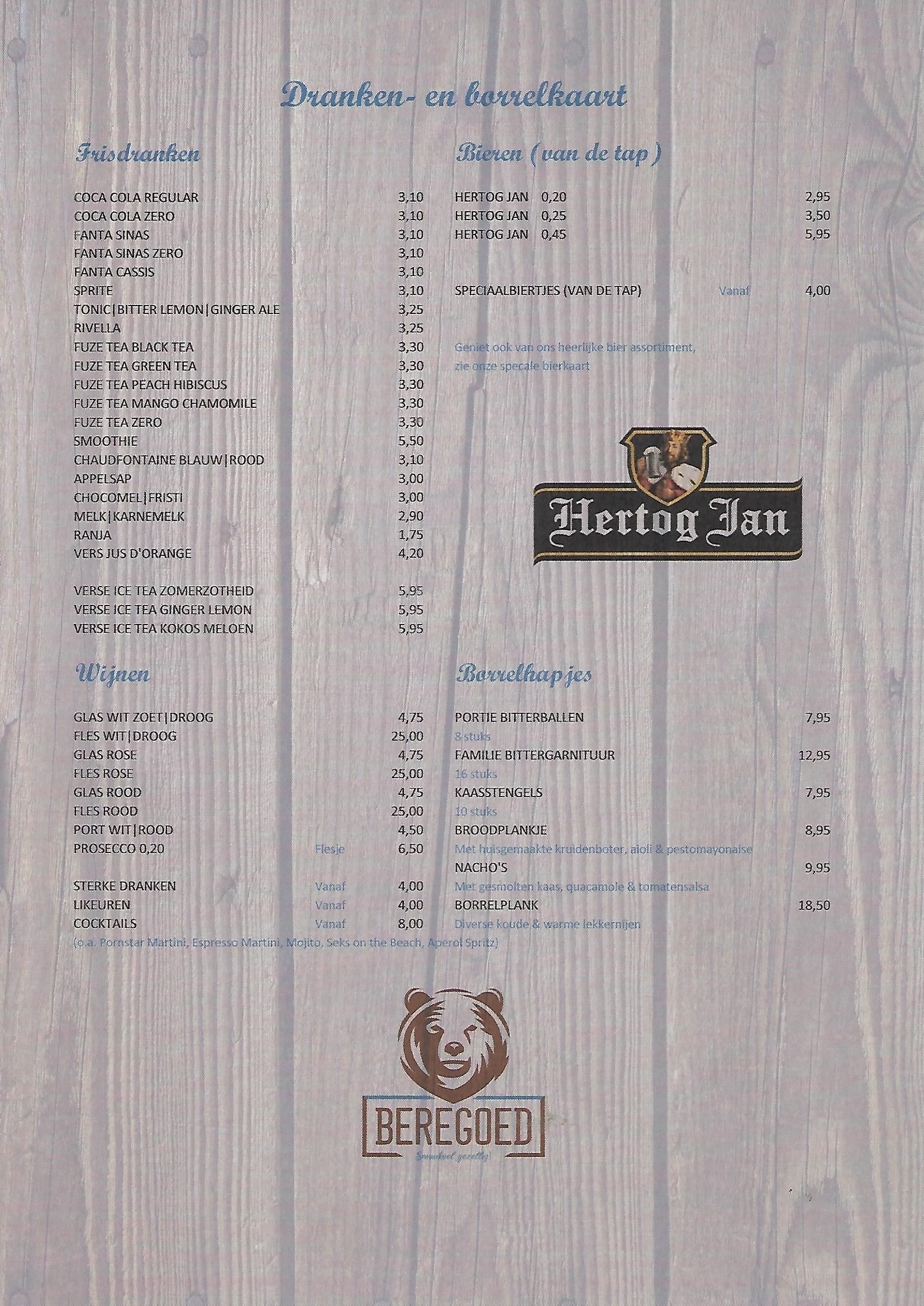 Naast de items hieronder bieden we tevens dagelijks voor slechts €15,00 een speciaal Beregoedmenu aan bereid met verse ingrediënten.